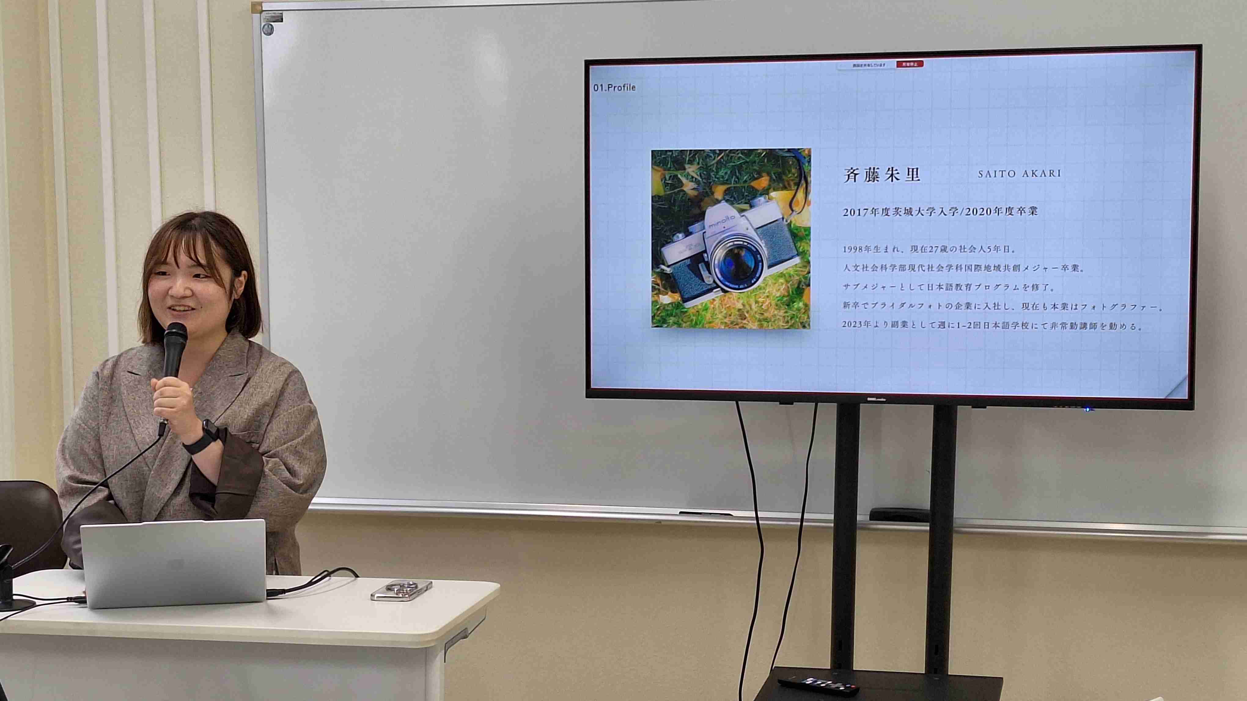 On October 20, 2025, we hosted an alumni talk at the Mito Campus featuring Ms. Akari Saito, a graduate of the Japanese Language Teacher Training Program. Ms. Saito currently works as a photographer in the bridal industry while also teaching part-time at a Japanese language school.