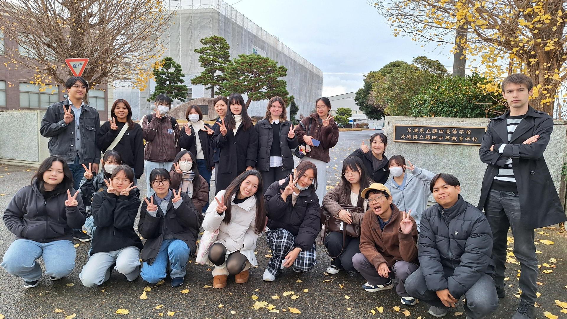 On December 3, twelve international students enrolled in the Japanese Language Training Course Level 4 (Intermediate) and thirteen Japanese students from the Japanese Language Teacher Training Program visited Katsuta Secondary School in Hitachinaka City to engage in a collaborative session with twenty third-year junior high school students from the school’s “Future Exploration Global Seminar.”