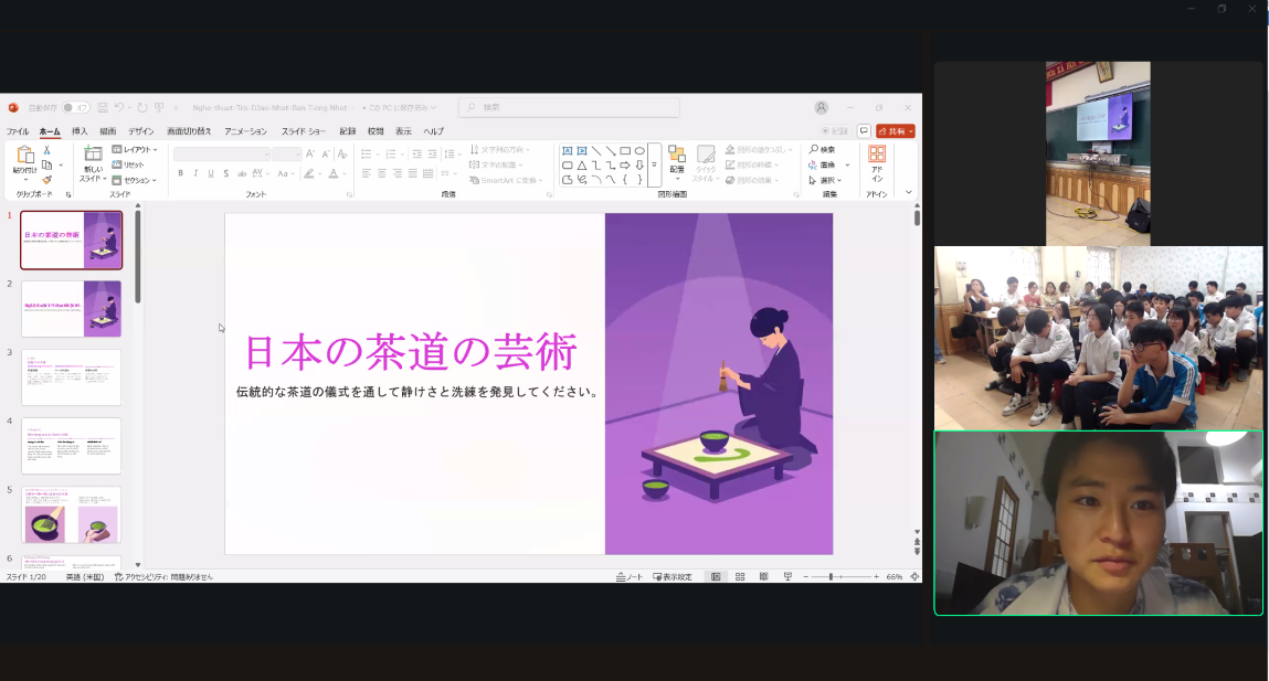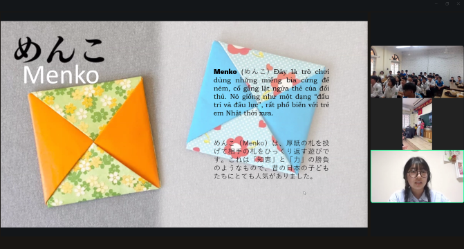 今回のベトナム側のイベントは、ハイフォン大学の学生が中心となって企画・準備を行い、現地の高校生に向けて日本文化を紹介するプログラムを構成しました。茨城大学からは学生3名がオンラインで参加し、日本語で説明を行いながら、ハイフォン大学の学生がベトナム語に通訳する形で交流が進められました。