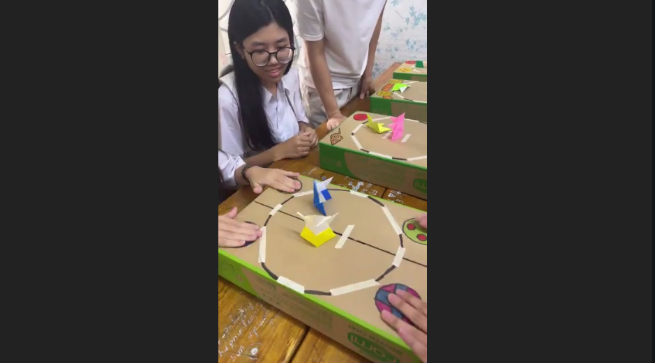 🥋 紙相撲体験:担当学生は、紙で作った力士や土俵を実際に画面越しに見せながら、紙相撲の作り方や遊び方を丁寧に説明。現地の高校生も興味津々で、手作りの道具に親しみを感じていました。