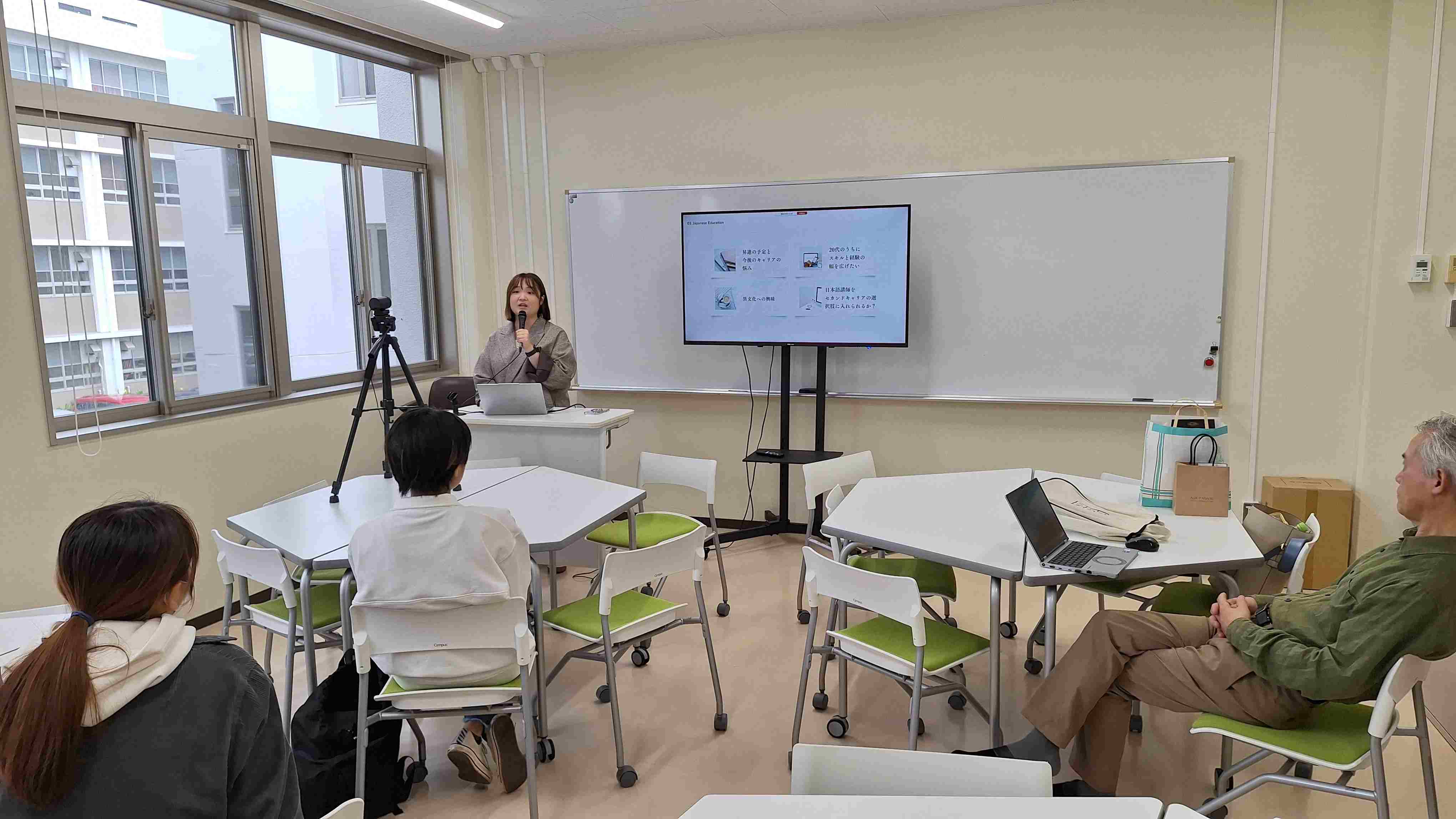講演では、大学卒業後のキャリア選択、副業として日本語教育を始めた理由、そして教育現場での実践について、具体的な経験を交えて語っていただきました。「20代のうちに複数のスキルを身につけたい」「異文化への関心」「将来のセカンドキャリアとしての可能性」など、学生にとっても共感しやすい視点が多く含まれていました。日本語学校での授業準備や学生との関わり、生活指導の工夫など、現場のリアルな様子も紹介され、教育のやりがいや難しさが伝わる内容となりました。特に、夜間にアルバイトをしながら学ぶ留学生の姿や、異文化間での摩擦への対応など、教育者としての葛藤も率直に語られました。