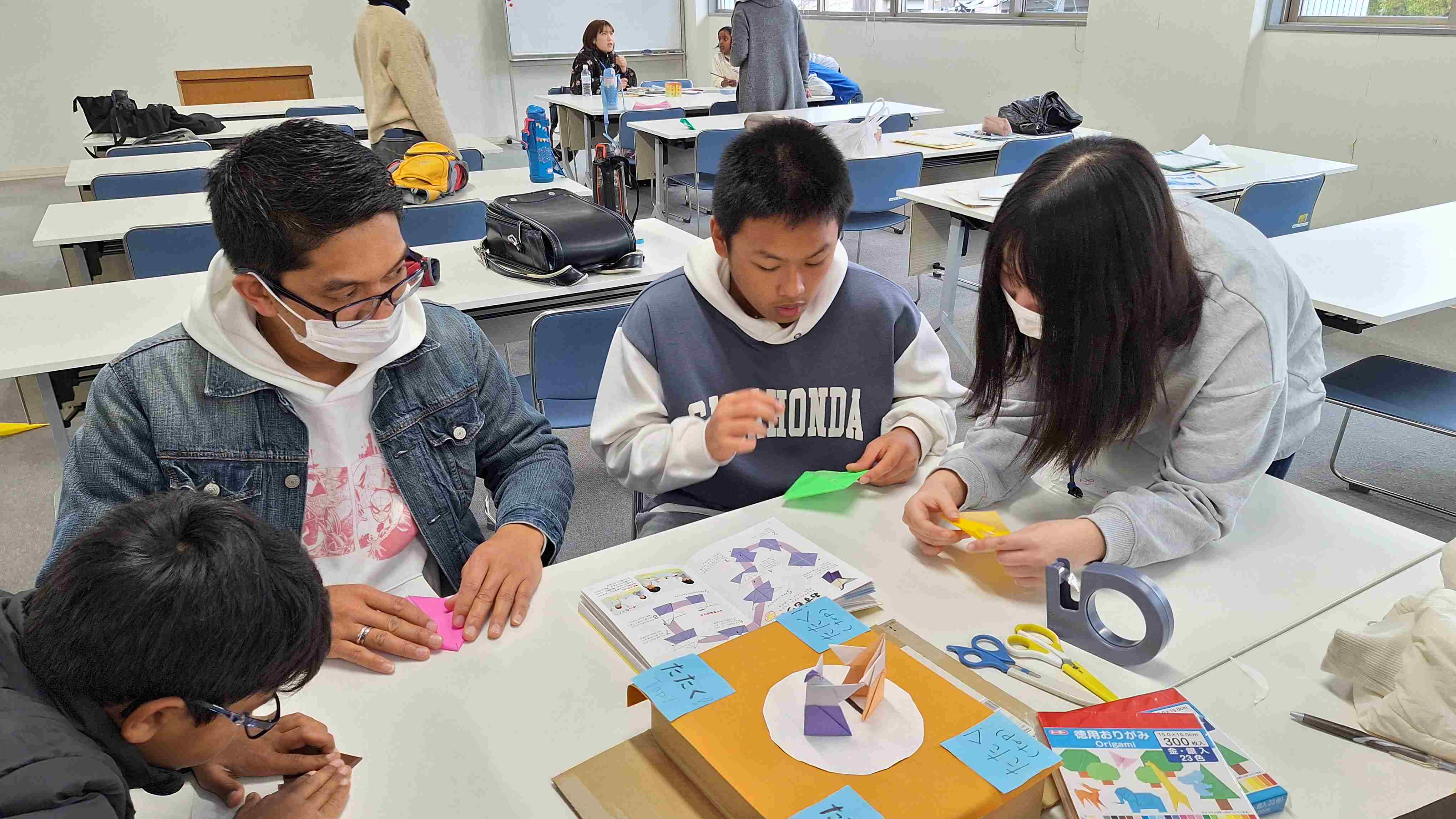 午後は、大学生が準備した遊びの時間です。折り紙で作る「とんとん相撲」や「めんこ」、笑顔があふれる「福笑い」、漢字・ひらがなのカードゲーム、そしてオリジナル年賀状づくりなど、楽しいブースが並びました。子どもたちは思い思いに遊び、2時間があっという間に過ぎるほど充実した時間を過ごしました。帰り際には「楽しかった」「また来年もやりたい」という声が聞かれ、参加した学生も「子どもたちの元気に驚いた。また参加したい」と話していました。