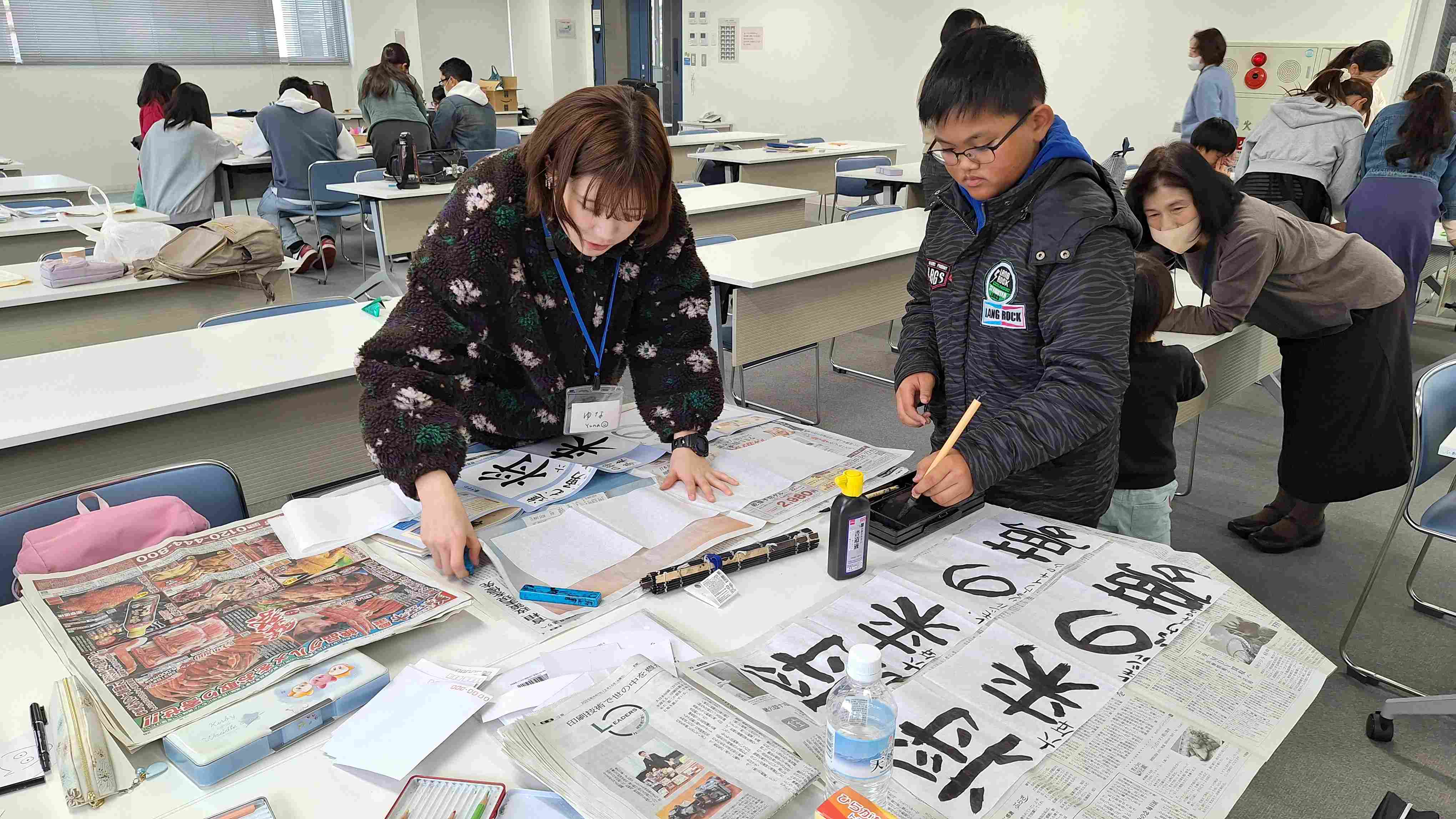午前中は、子どもたちの冬休みの宿題を大学生がサポートしました。紙のドリルやタブレット学習に取り組む子、習字を仕上げる子など、さまざまな課題に挑戦する姿が見られました。特に習字は家庭で取り組むには難しい課題ですが、大学生のお兄さんとお姉さんの力を借りながら、ダイナミックに文字を書いている姿が印象的でした。