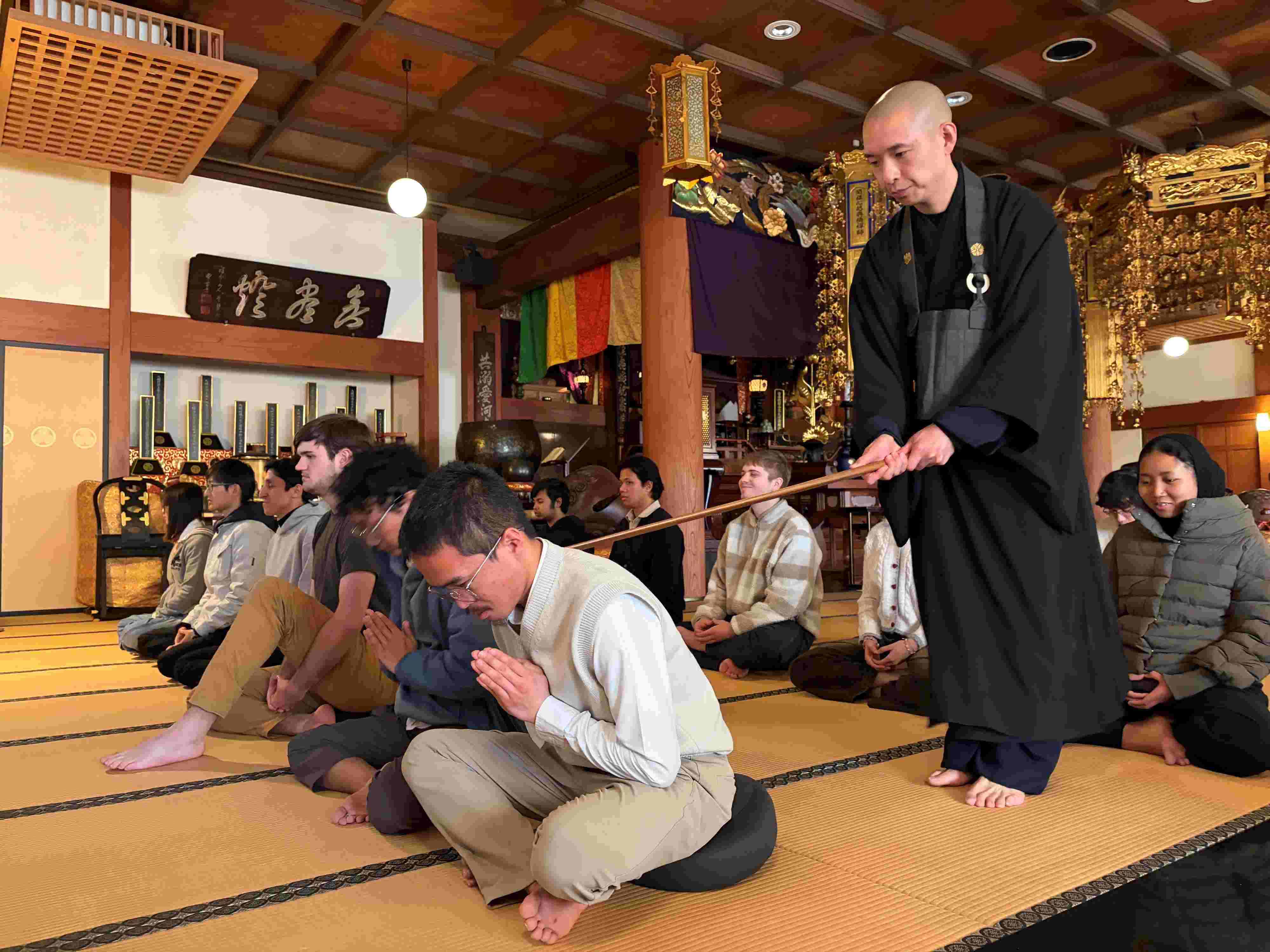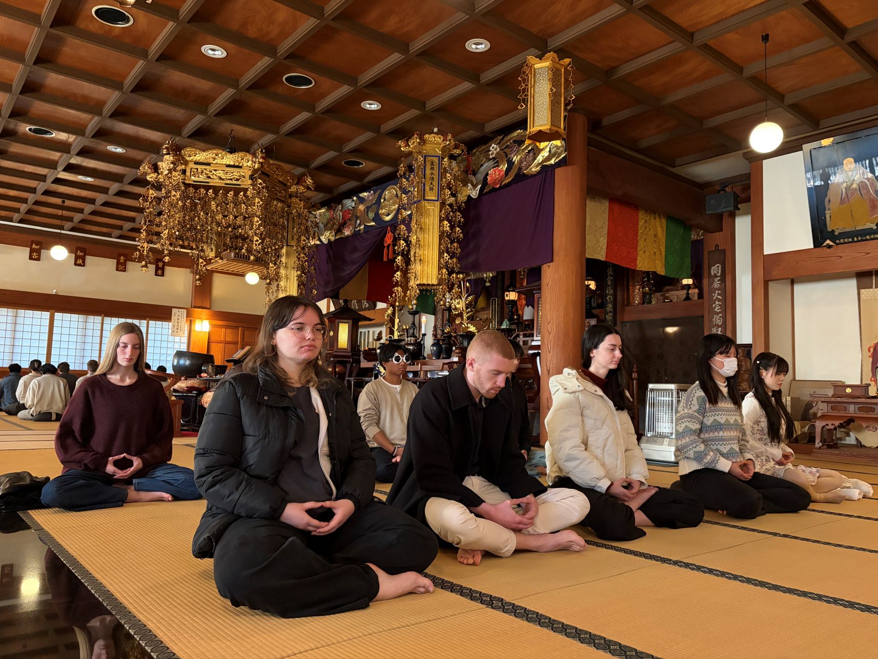 12月19日(金)、日本体験学習Bで授業の一環として坐禅体験を実施し、留学生22名が参加しました。事前研修では、坐禅の歴史、基本知識について調べ、当日は実際に祇園寺にて坐禅体験を通して、日本文化を体験しました。体験後の振り返りでは、静寂の中で自分自身と向き合う時間が、日本文化への理解だけでなく、自己理解を深める機会にもなったという声が多く聞かれました。